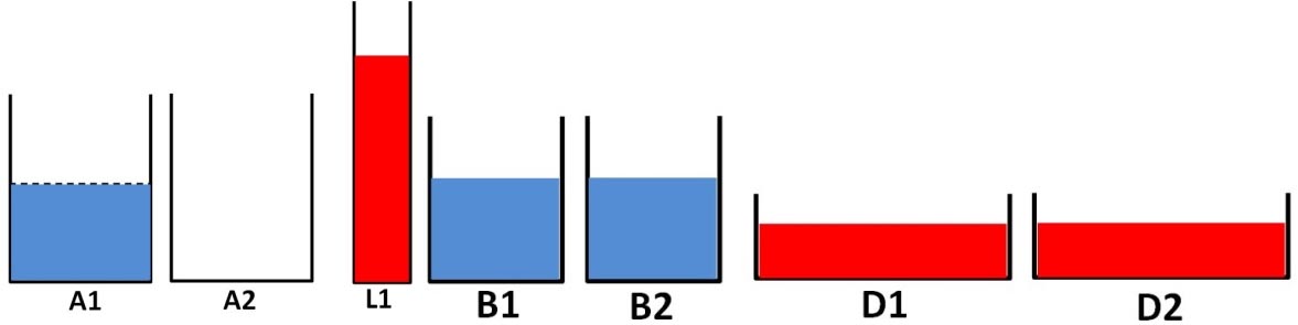 Figure 25 - Et alors si on reverse le bleu et le rouge ici (A2 et A1), le rouge arrivera plus haut ou ce sera la même chose ? — Plus haut. » Sim reverse D1 et D2 en A2 et B1 et B2 en A1 : elle est très étonnée de voir que c'est le même niveau. [Piaget 1941a : 21.]