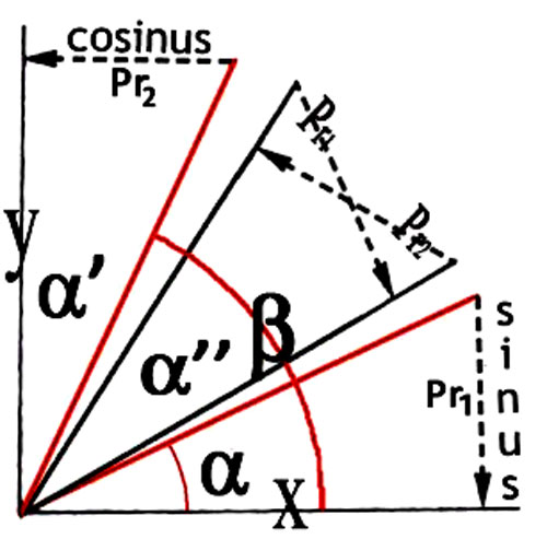 Pappus – I. Un rectangle euclidien A de hauteur h et base l [Fig. 70cd] est saisi par Pappus à partir du seul principe de synthèse de son appartenance à la forme d’ensemble du cercle trigonométrique, en tant qu’intuition fondée sur la vision projective de cette configuration globale, qui perçoit h comme sina?, l comme cosa? et d comme r. – II – Or, cette méthode d’appréhension, qui impose la prédominance de l’intuition projective de l’espace trigonométrique, distingue absolument entre axe vertical et axe horizontal. La base l = cosa du rectangle apparaît placée sur l’axe horizontale, tandis que la hauteur h = sina?apparaît placée sur l’axe verticale. III – En conséquence de cette irréversibilité, lorsque Pappus perçoit le rectangle L=A, mais avec la hauteur h= cosß?et la base l = sinß??– à savoir le même rectangle euclidien mais réorienté, avec la hauteur h sur l’axe horizontal et la base l sur l’axe vertical – il voit que dans le rectangle avec la base redressée il y a plus d’ampleur que dans ce même rectangle avec la base couchée sur l’horizontale. IV Aux yeux de Pappus – pour sa vision et pour son esprit– la différente configuration projective des deux figures trigonométriques l’emporte donc sur leur égalité euclidienne, et impose enfin une prédominance quantitative, en termes d’ampleur, de la verticale sur l’horizontale. Sa vision le convainc qu’il y a plus d’ampleur dans l’un que dans l’autre, même si c’est Pappus en personne qui vient de réorienter le rectangle A = sina/cosa??en en faisant le rectangle L= sinß/cosß?? A.