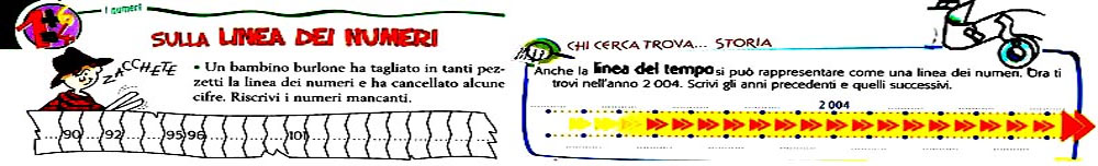 Figure A3ab [a) « Un enfant farceur a coupé en petits morceaux la ligne des nombres, en effaçant des chiffres. Récris les nombres qui manquent ». b) « Même la ligne du temps peut être représentée comme une ligne des nombres. Maintenant tu es en 2004. Écris les années précédentes et suivantes. » Lelli 2004, Vol.3]