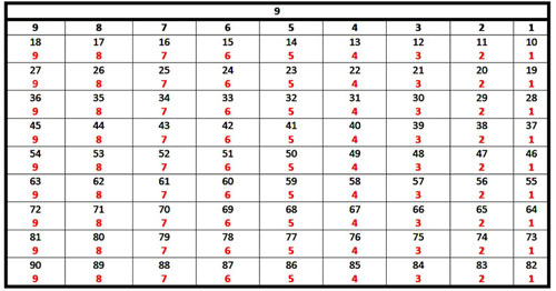 Figure A7 - Les différentes façons de se déployer d’une table de comptage selon le « module » choisi, montrent les inépuisables couches d’« harmonie arithmétique » qui composent l’identité vivante de l’« arbre des nombres »